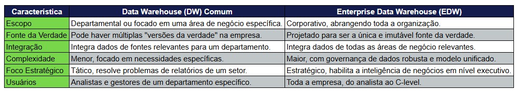 Em resumo, enquanto um DW resolve um problema tático, o EDW resolve um desafio estratégico fundamental: garantir que toda a organização tome decisões baseada em um conjunto de informações consistente, confiável e unificado.